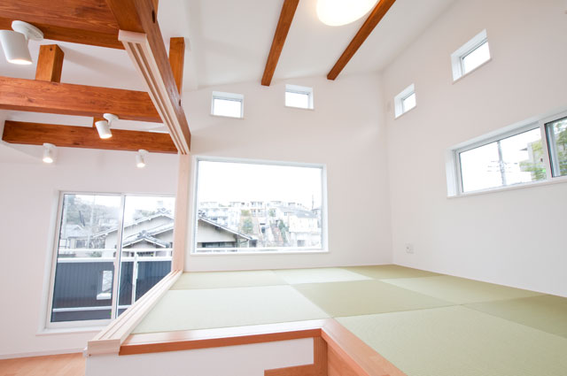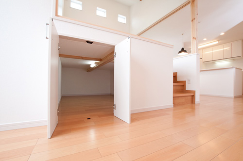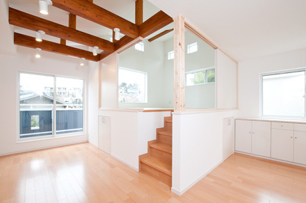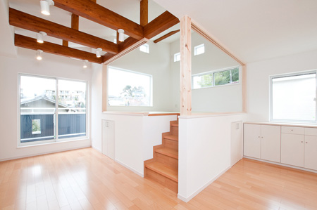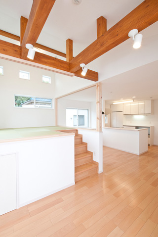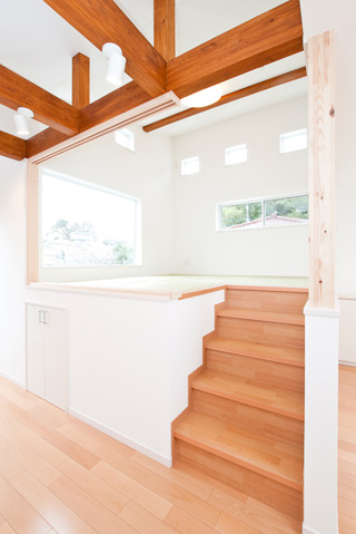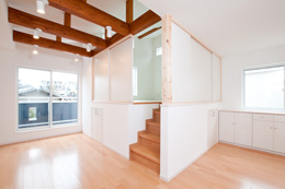 各居室よりも家族みんなが集まるリビングを充実させて・・・というお客様のご要望から、人目を気にせず窓を設けれる2階にLDKを配置しました。勾配天井とし、タテの広がりをいかしつつ、最も天井が高くなる部分に床を上げて「和」スペースを設けました。もちろん、下部は収納として活用します。この「和」スペースは梁の下に仕込んだ、取り外し可能の建具を装着すれば、個室としても機能します。