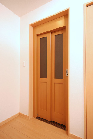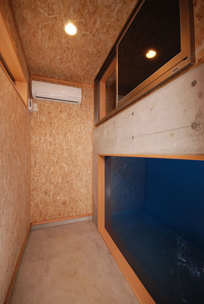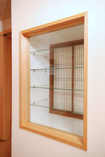 幅2m、長さ4m、深さ1.5m、巨大な水槽です。2階ダイニング部には先代が作成された彫金の作品を飾る、「飾り棚」を造作しました。和室側からのみ開閉可能で、和室側には旧ご自宅から持参された、建具を取り付けました。床は「コルク床」を採用しています。足の悪いお母様に配慮された、息子様の優しいお心遣いです。