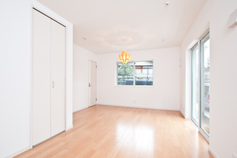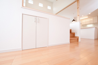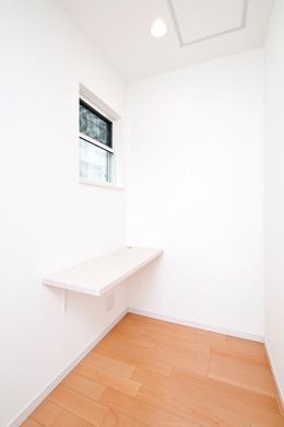 各居室よりも家族みんなが集まるリビングを充実させて・・・というお客様のご要望から、人目を気にせず窓を設けれる2階にLDKを配置しました。勾配天井とし、タテの広がりをいかしつつ、最も天井が高くなる部分に床を上げて「和」スペースを設けました。もちろん、下部は収納として活用します。この「和」スペースは梁の下に仕込んだ、取り外し可能の建具を装着すれば、個室としても機能します。