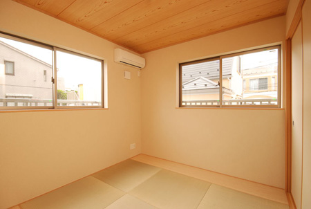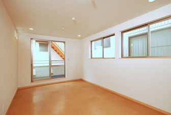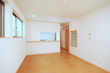 幅2m、長さ4m、深さ1.5m、巨大な水槽です。2階ダイニング部には先代が作成された彫金の作品を飾る、「飾り棚」を造作しました。和室側からのみ開閉可能で、和室側には旧ご自宅から持参された、建具を取り付けました。床は「コルク床」を採用しています。足の悪いお母様に配慮された、息子様の優しいお心遣いです。
